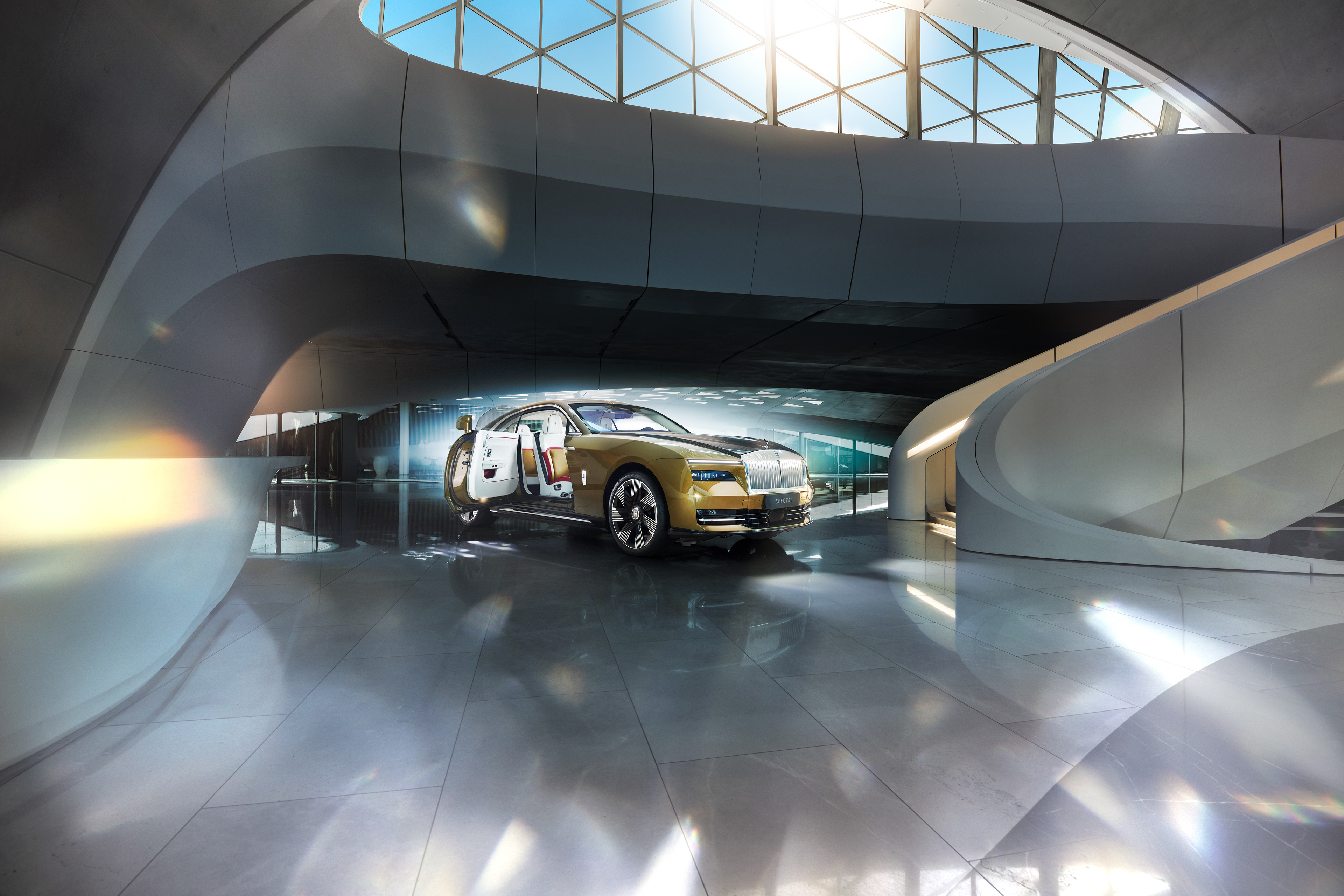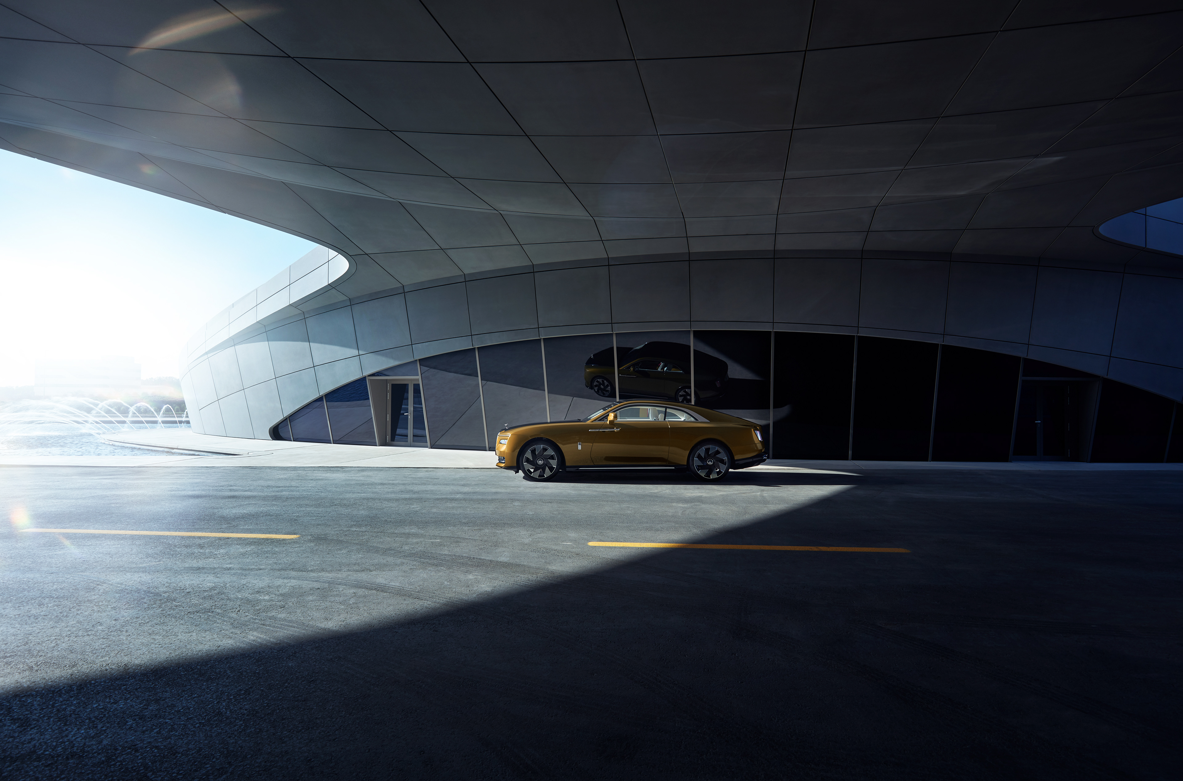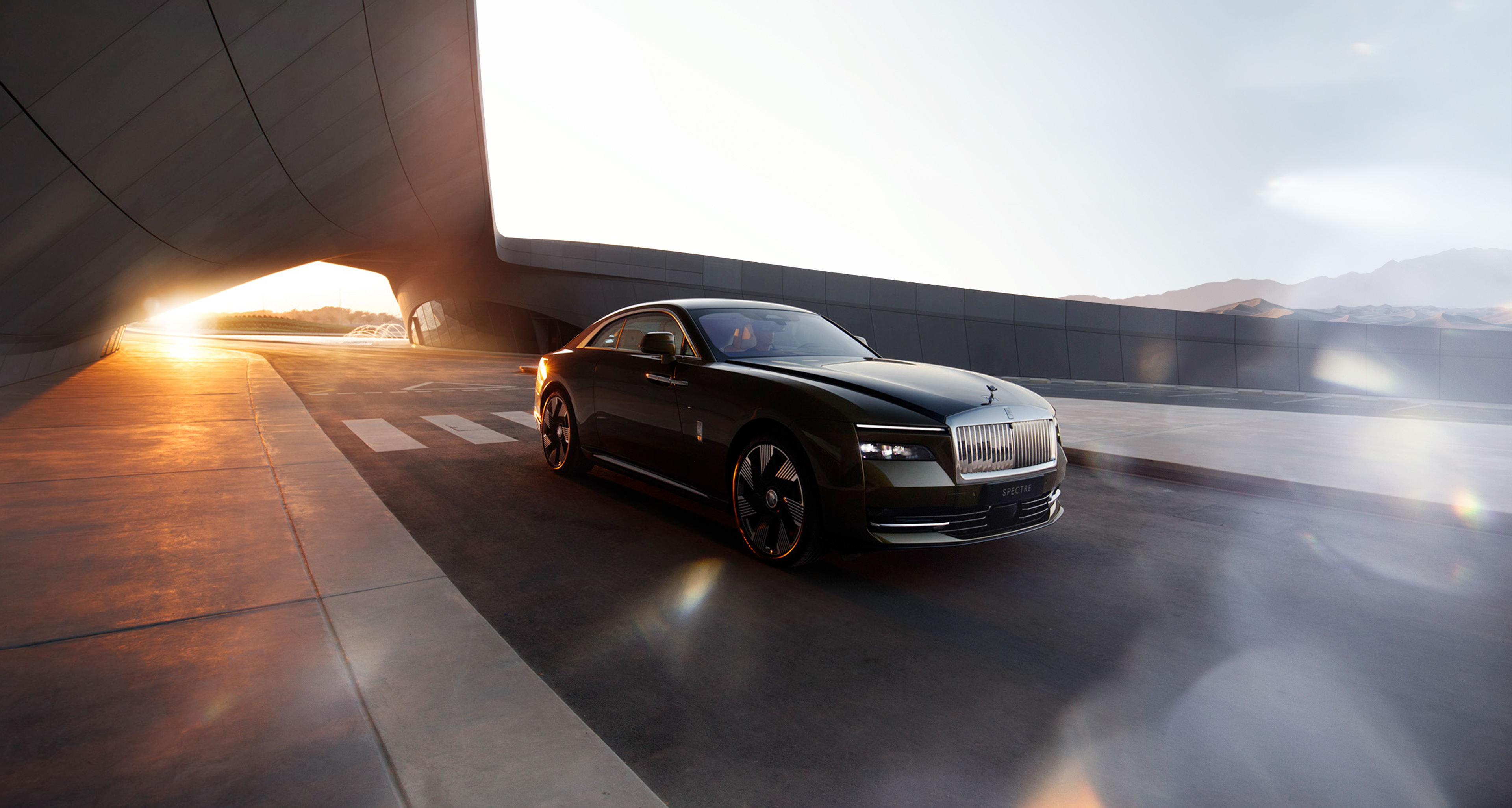 Rolls-Royce Spectre shot for UAE in Zara Hadid's incredible Beeah recycle headquarters in Sharjah.