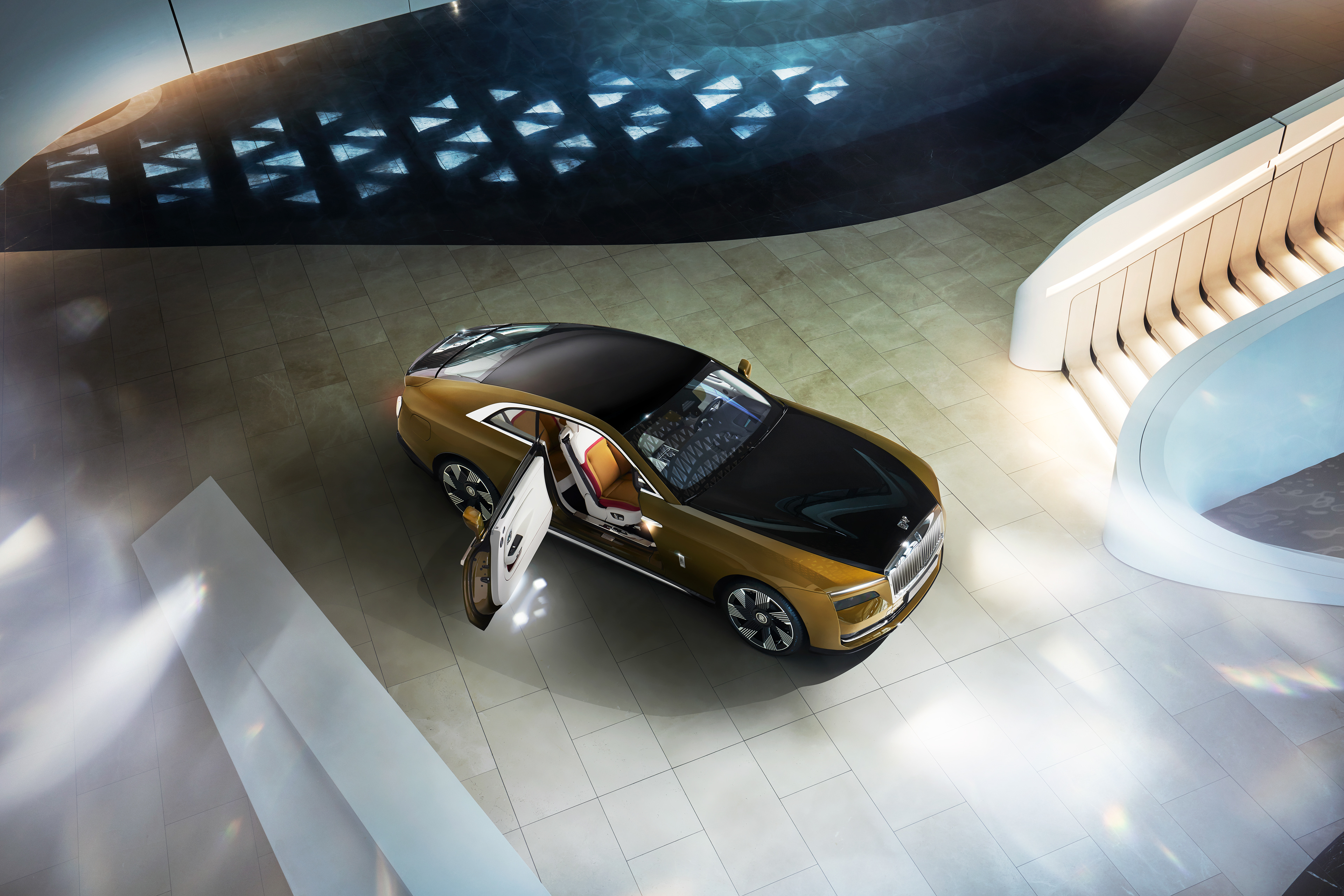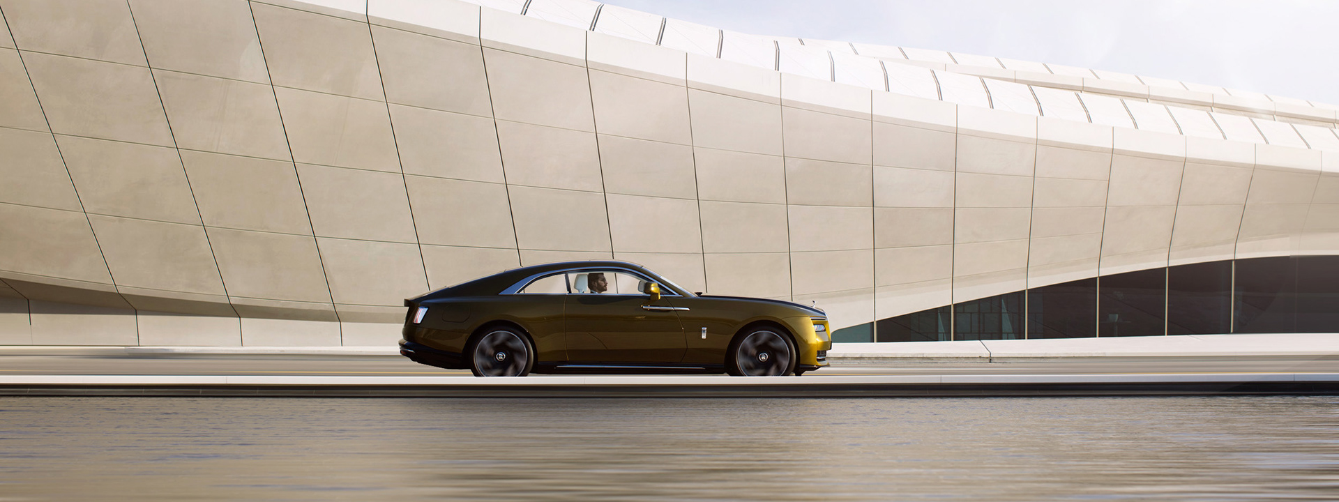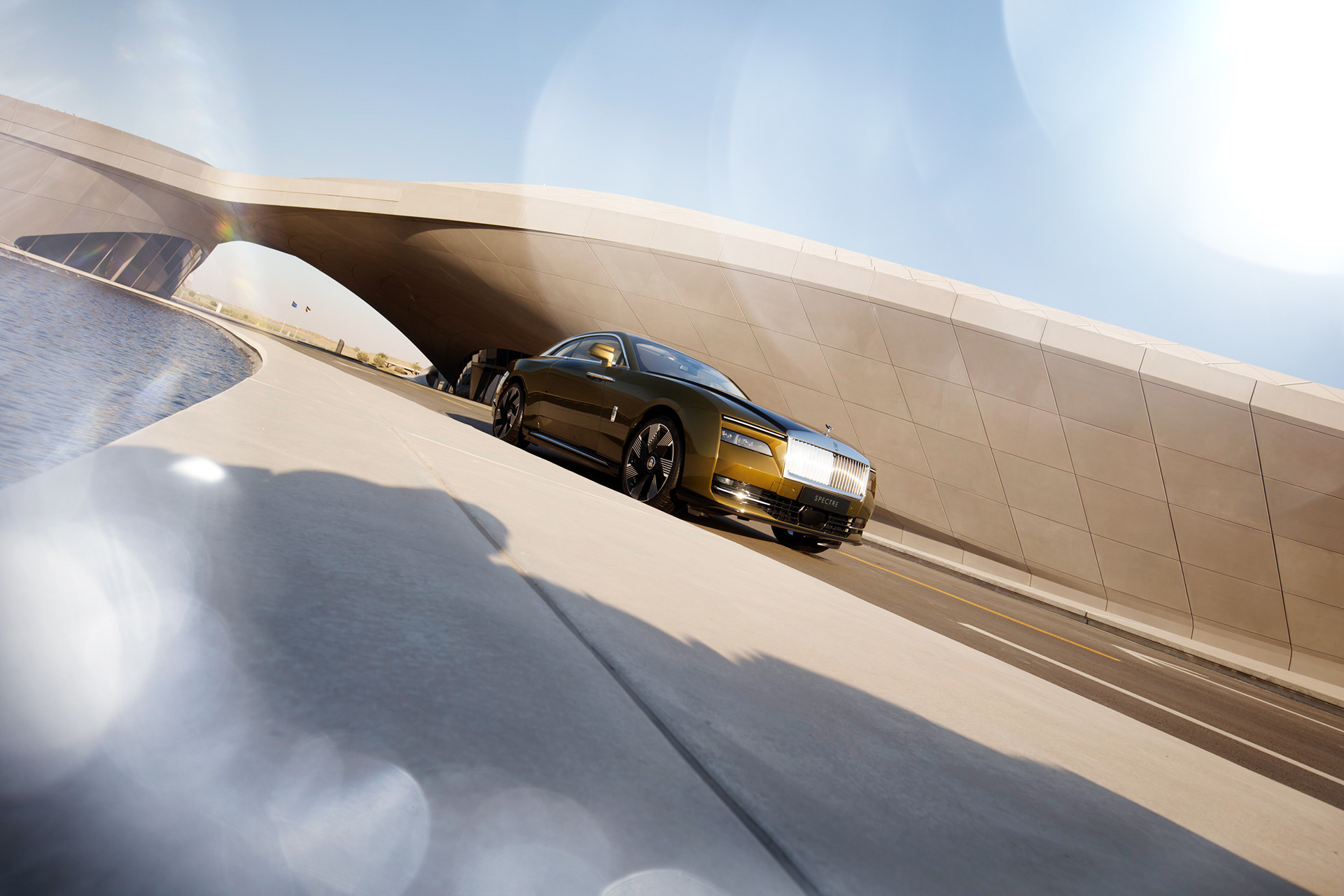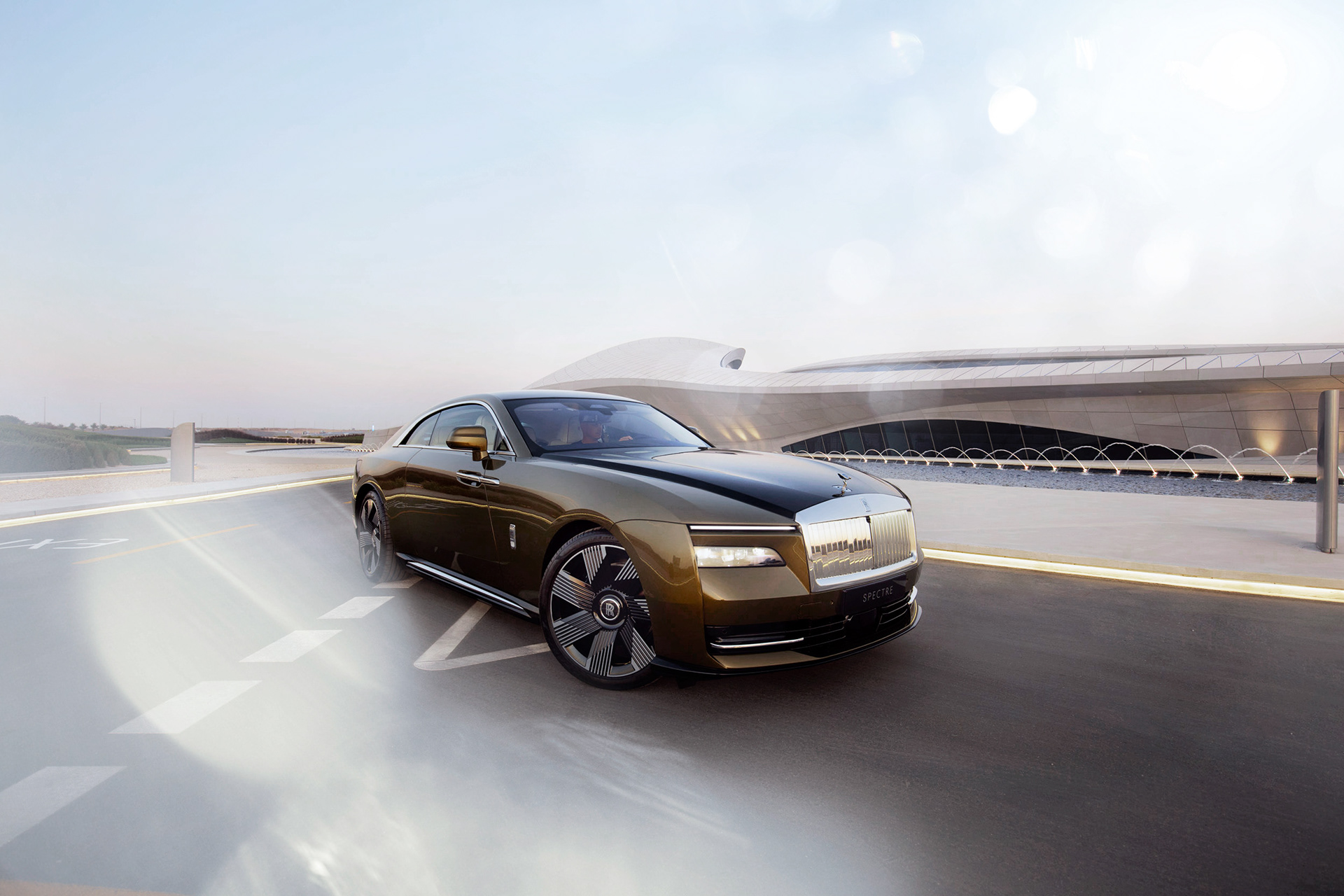 Rolls-Royce Spectre shot for UAE in Zara Hadid's incredible Beeah recycle headquarters in Sharjah.